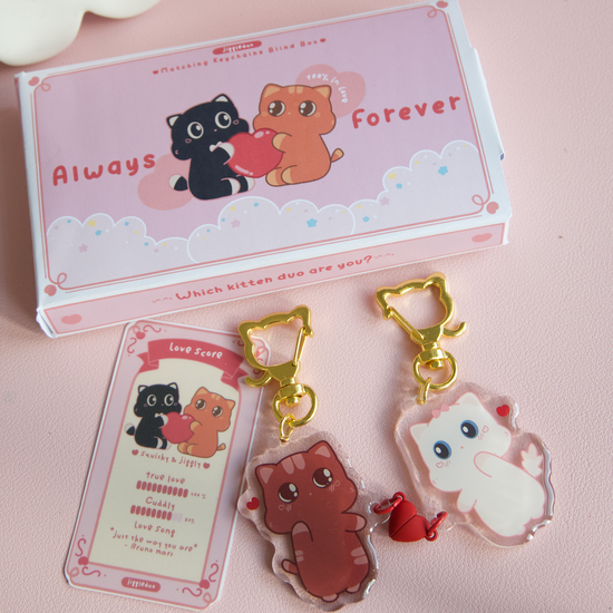 Surprise yourself or someone special with our “Always Forever” Blind Box, featuring 8 mystery cat designs—plus 1 rare secret duo to discover! Each set includes two matching acrylic keychains that magnetically snap together with a little heart when they’re close 💞